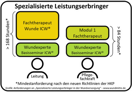 1. Voraussetzung für die fachliche Leitung der Wundversorgung: (Zusatzqualifikation von 168 UE) Beispiel: Wundexperte ICW® (56 UE) + Fachtherapeut Wunde ICW® (120 UE)